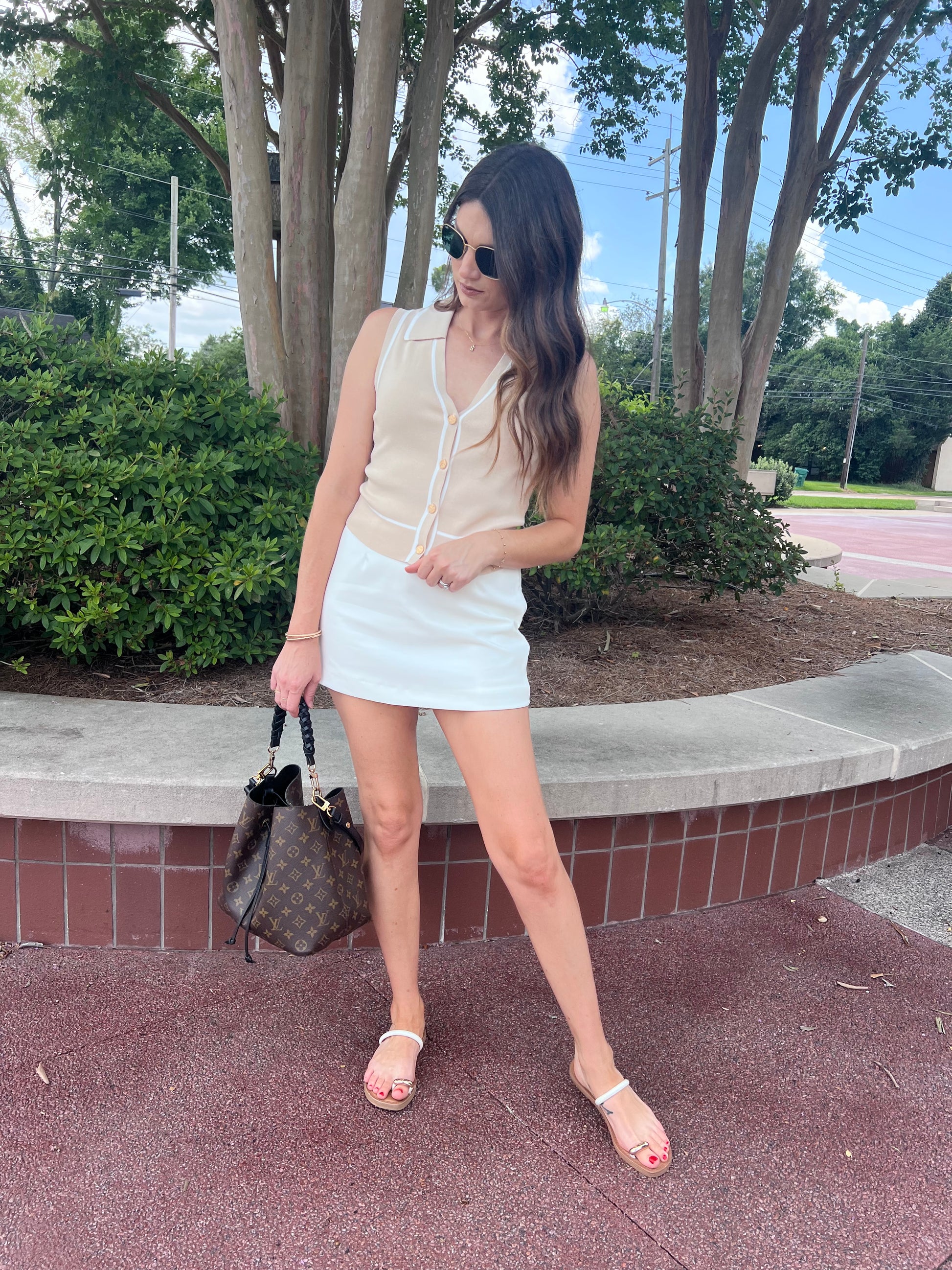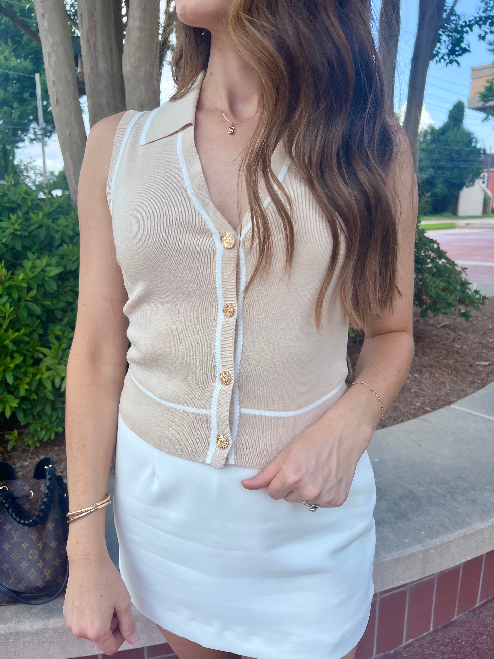 The Madison Vest Top is the most chic top for the summer. The taupe sweater material is very high quality. The collar at the neckline adds a casual vibe but the functional gold buttons immediately elevates it making it super timeless and chic. It features a white stripe detail throughout which adds dimension as a unique touch. Styled with The Serena Mini Skirt makes for a perfect summer outfit but styling with denim works as a more casual option.