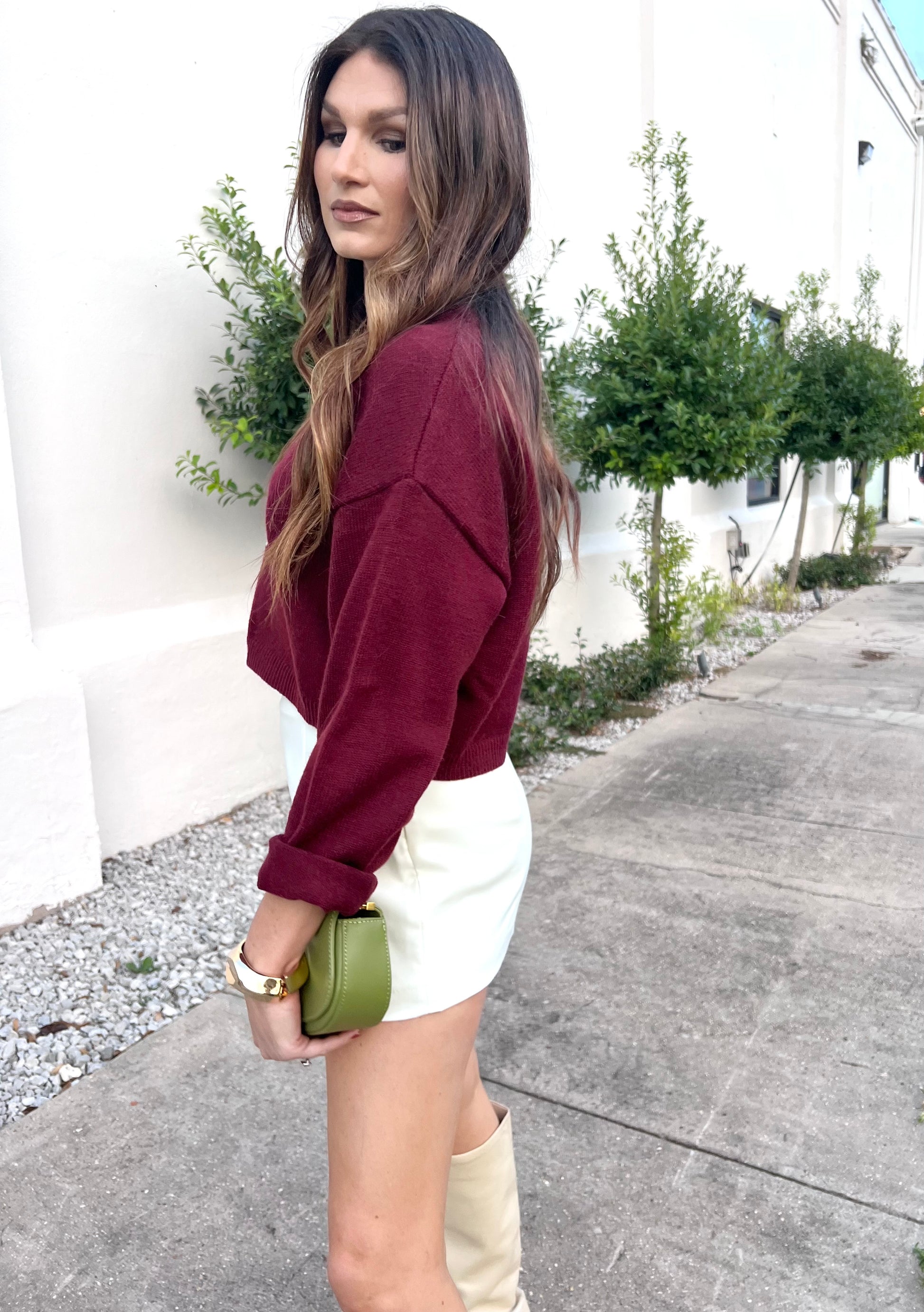 Calling all the dirty martini loving girls! This sweater is the perfect piece to add to your holiday outfit line up! The wine color makes it festive and the martini stitching makes it fun and girly. It is long sleeve and has a slightly cropped fit that pairs perfectly with any high waisted bottoms. You can dress it up with a maxi skirt and heels or dress it down with your favorite jeans. The material is super soft and high quality.